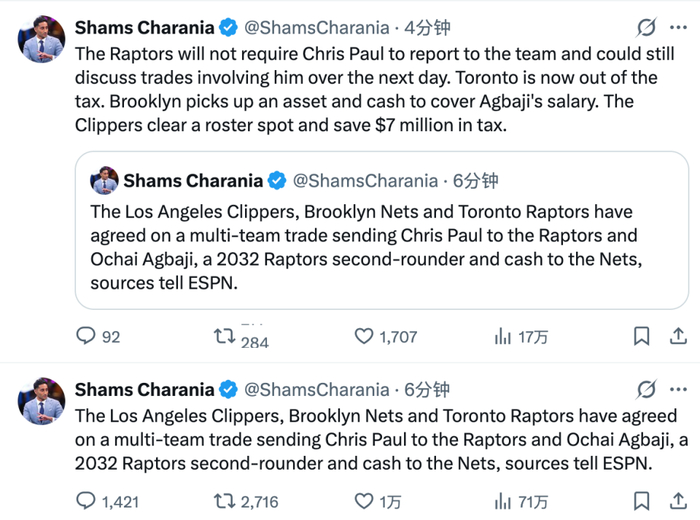 随后Shams还指出,猛龙队不会要求保罗向球队报到,并且可能在未来一天内继续讨论涉及他的交易。猛龙队在交易达成后已经无需缴纳奢侈税,篮网队获得了一笔资产和现金来支付阿格巴吉的薪水。快船队腾出了一个阵容名额,并节省了700万美元的奢侈税。